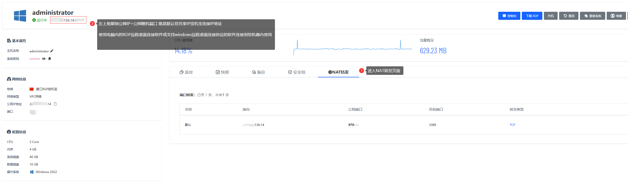 前往轻云官网产品的控制面板“NAT转发”查看用于连接机器内的公网IP地址和随机生成的公网端口并复制